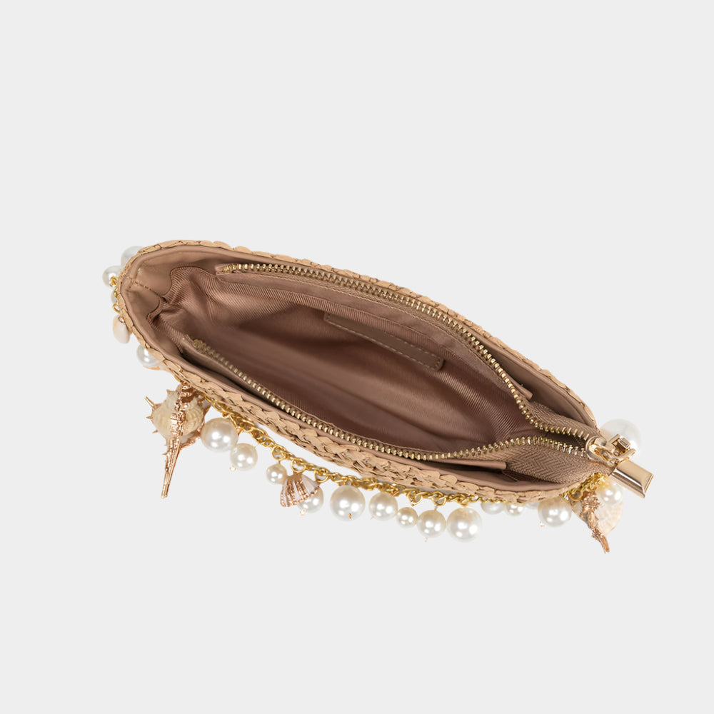 We can just feel the ocean with the Bahari— a masterpiece of a bag! Whether you are heading to a beach party or summery sunset wedding, this seashell raffia bag is the perfect way to go.