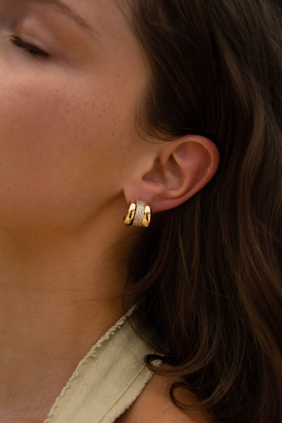 Sparkling and timeless, these wide huggie hoops are adorned with glimmering pavé cubic zirconia and plated in gleaming 14-karat gold.