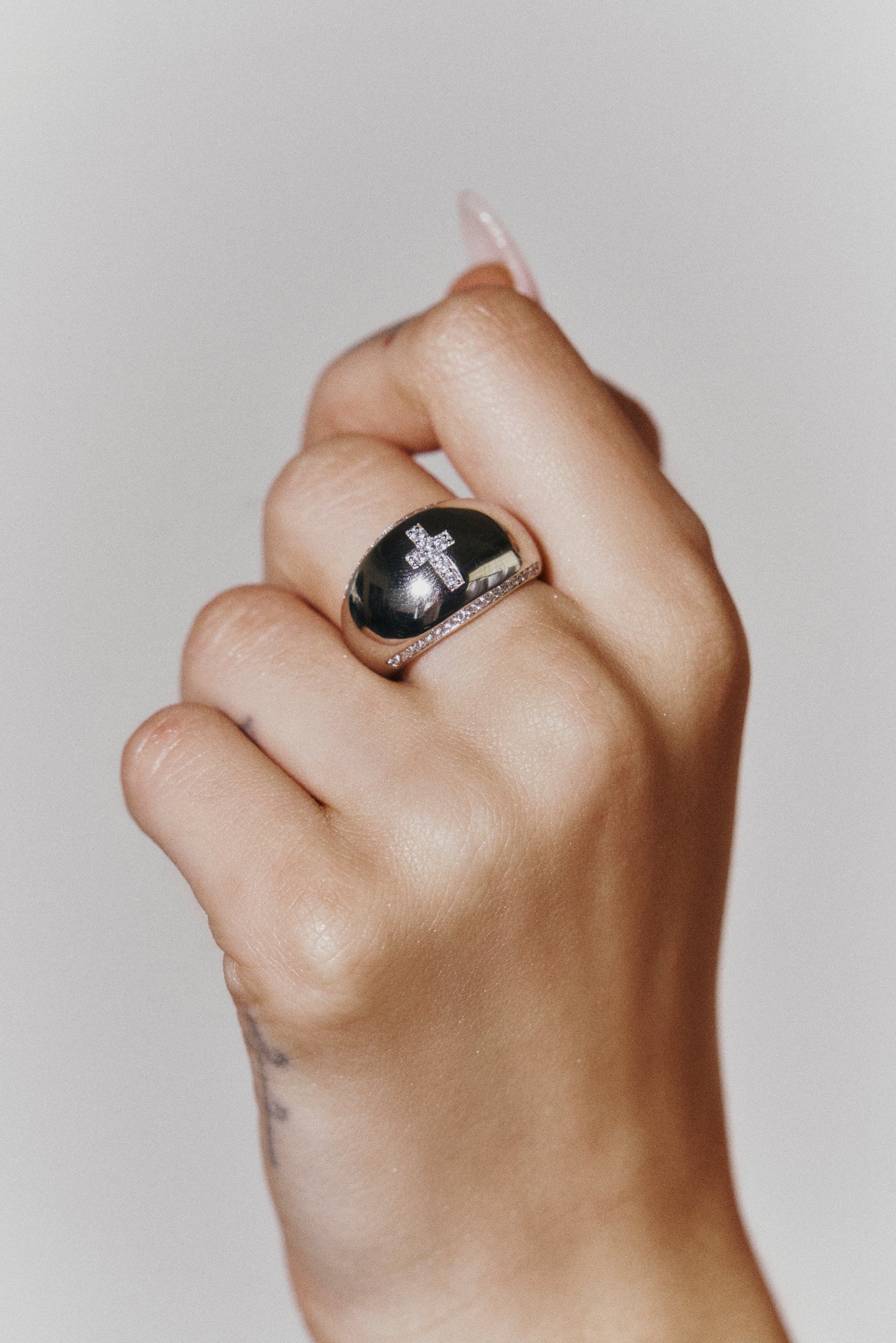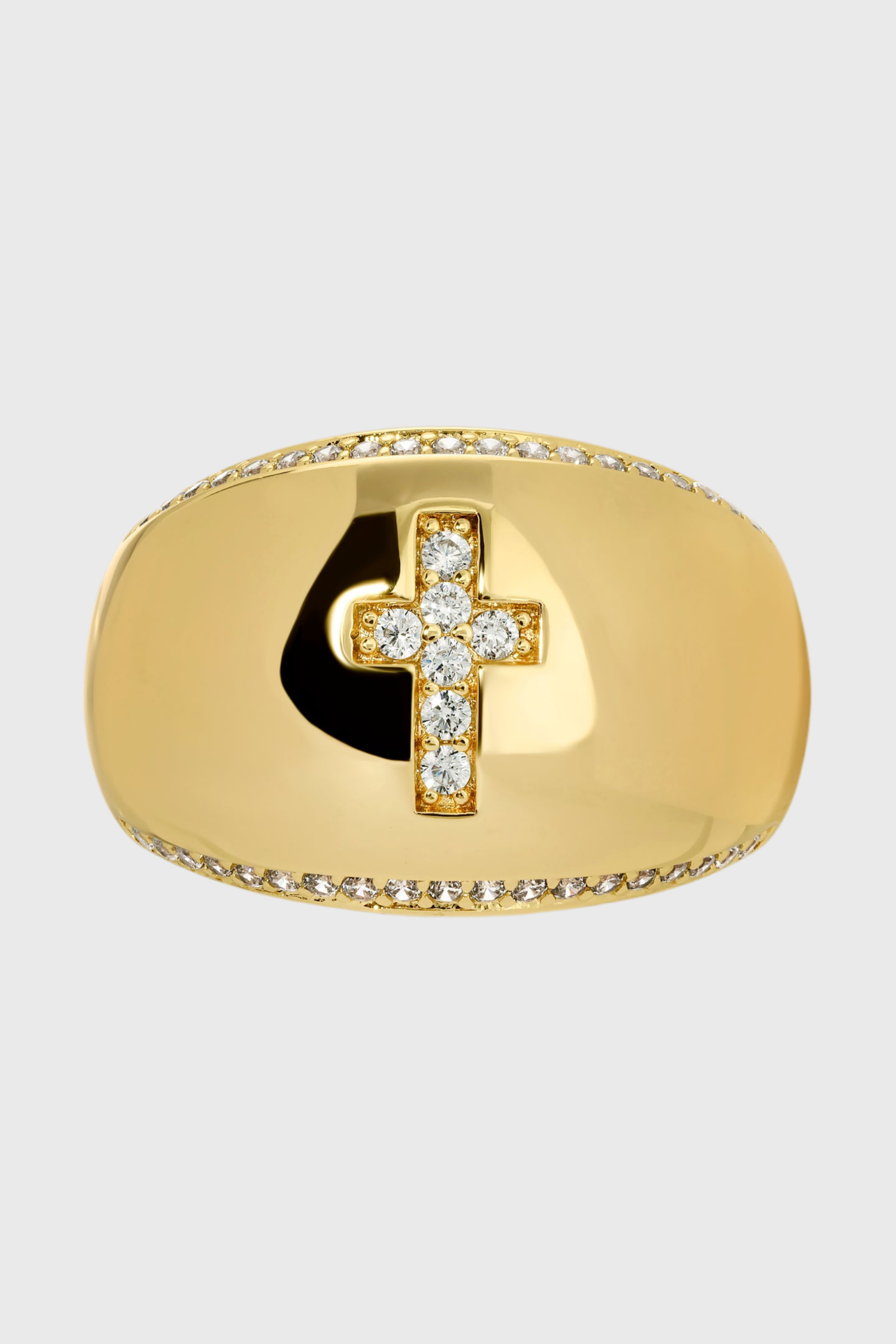 BOLD AND LIGHTWEIGHT, THIS SMOOTH DOMED DESIGN IS EMBELLISHED WITH A SINGLE PAVÉ CROSS CENTERED AT THE TOP FEATURING PAVÉ DETAILING ALONG THE EDGES.
