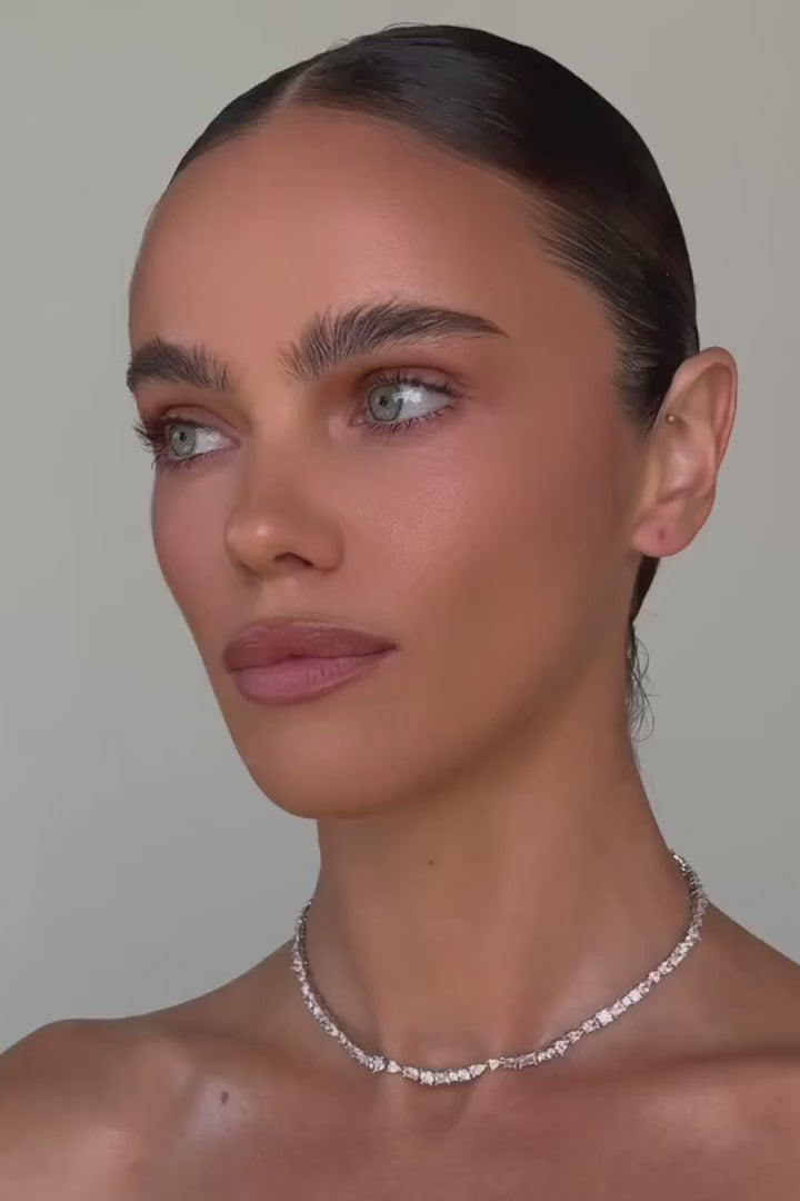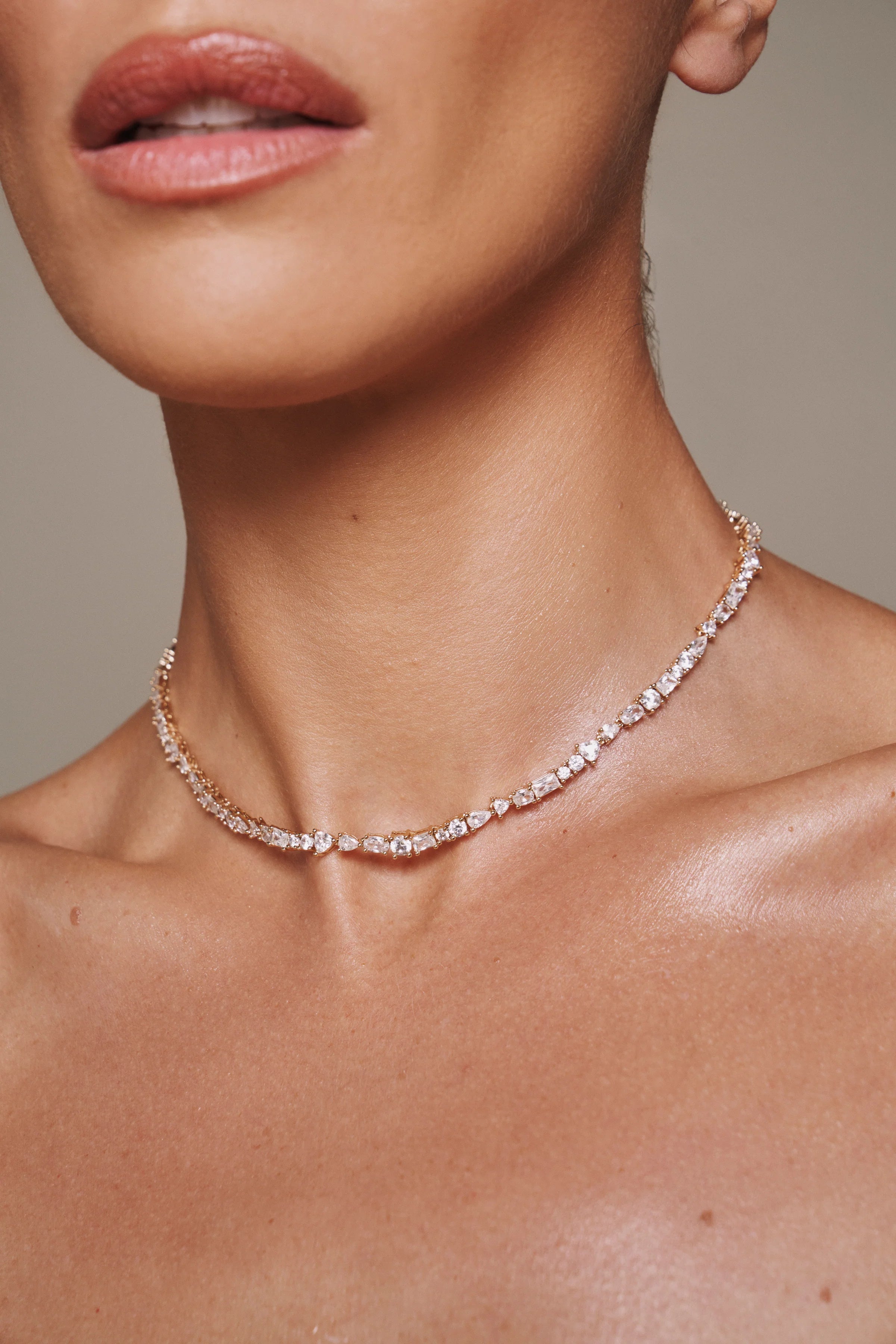 This tennis necklace features an intricate cluster of stones in various cuts and sizes