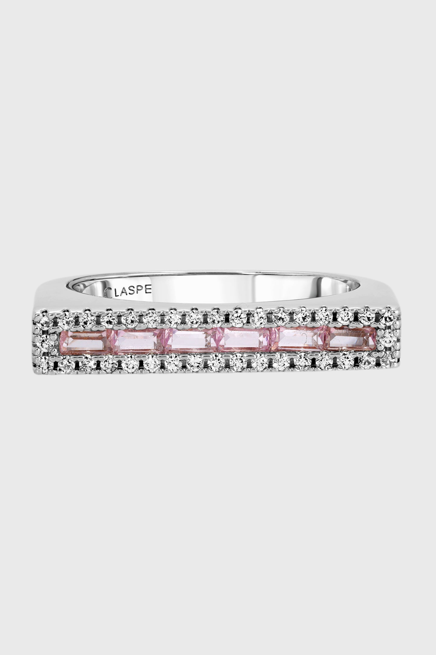 A HORIZONTAL BAGUETTE RING MADE UP OF SIX PINK CZ CHANNEL-SET BAGUETTES WITH PAVE SETTING