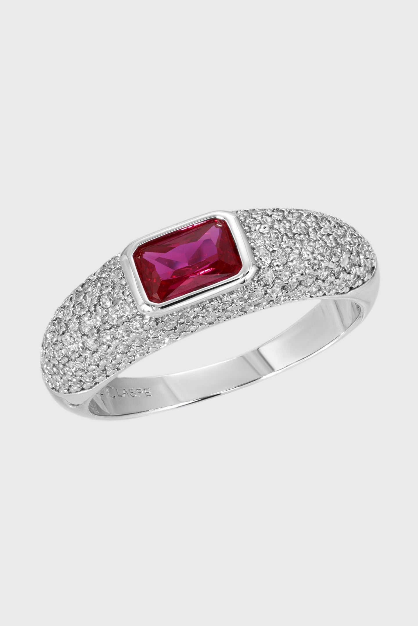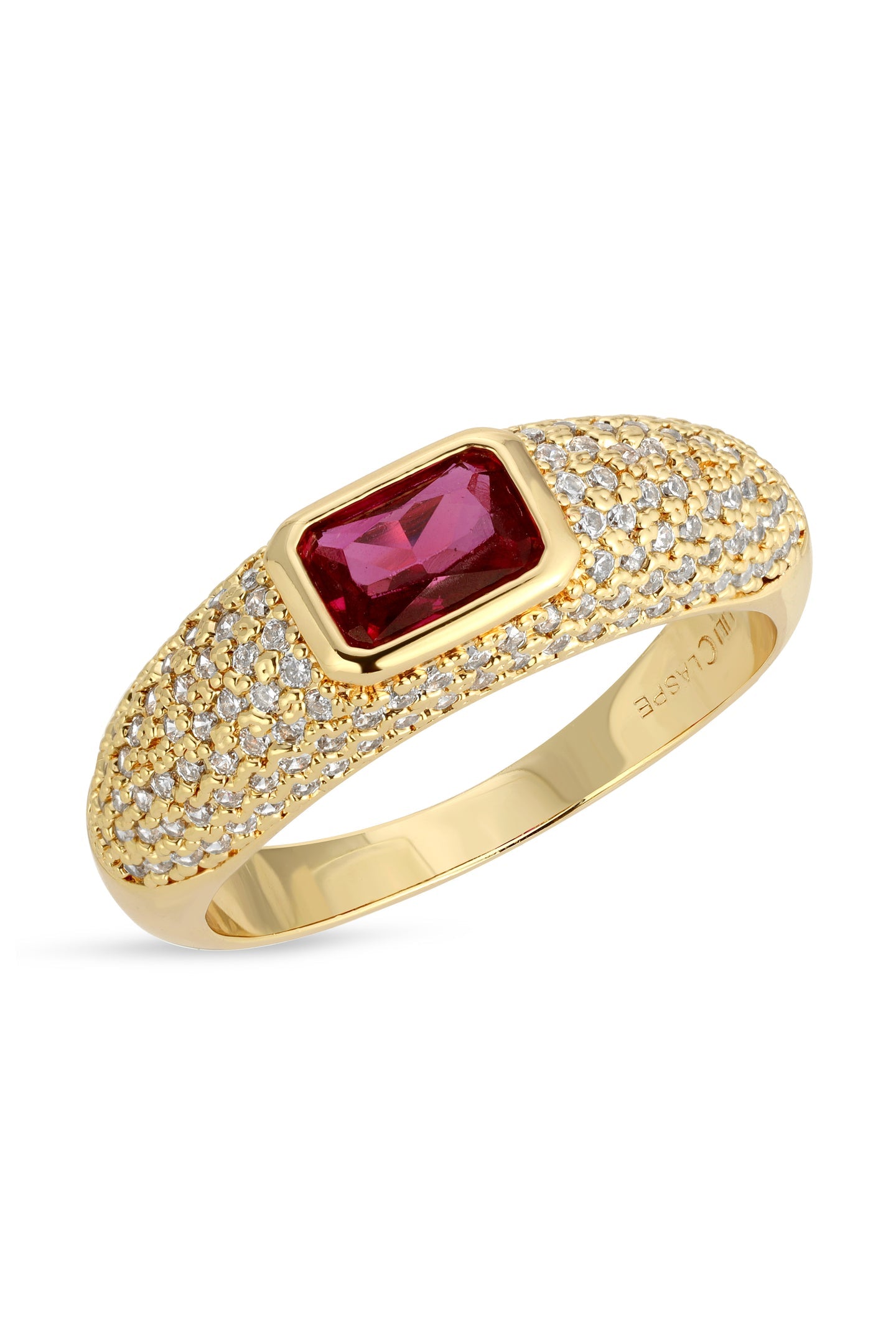 PAVE DOME RING WITH A RUBY CZ EMERALD CUT CENTER STONE