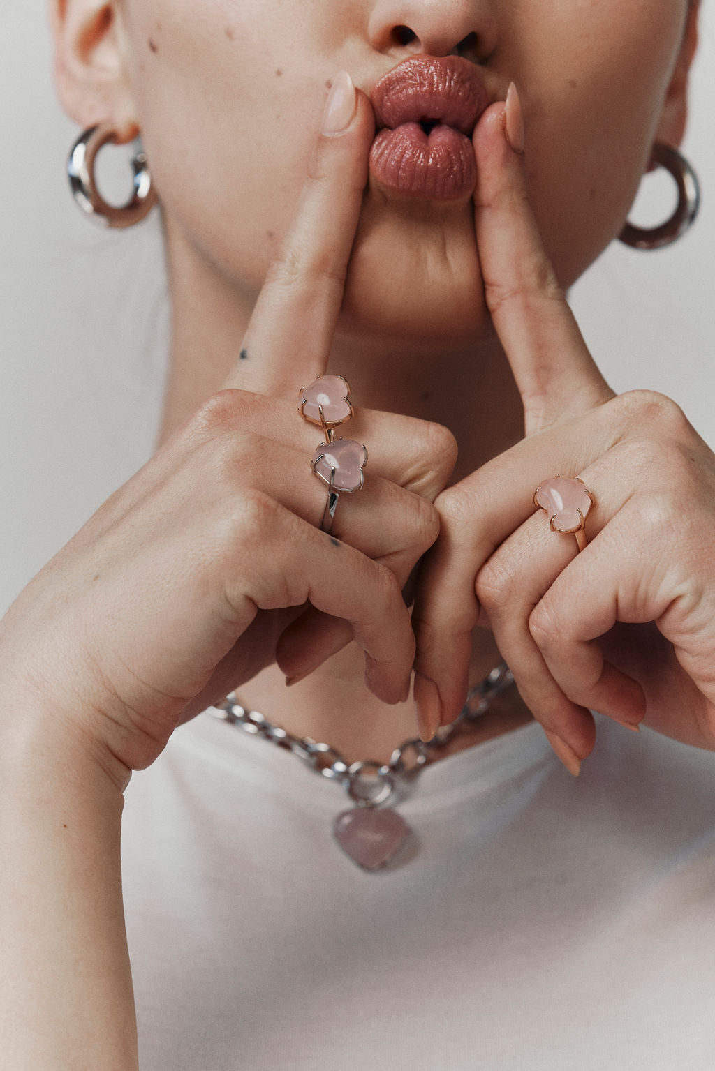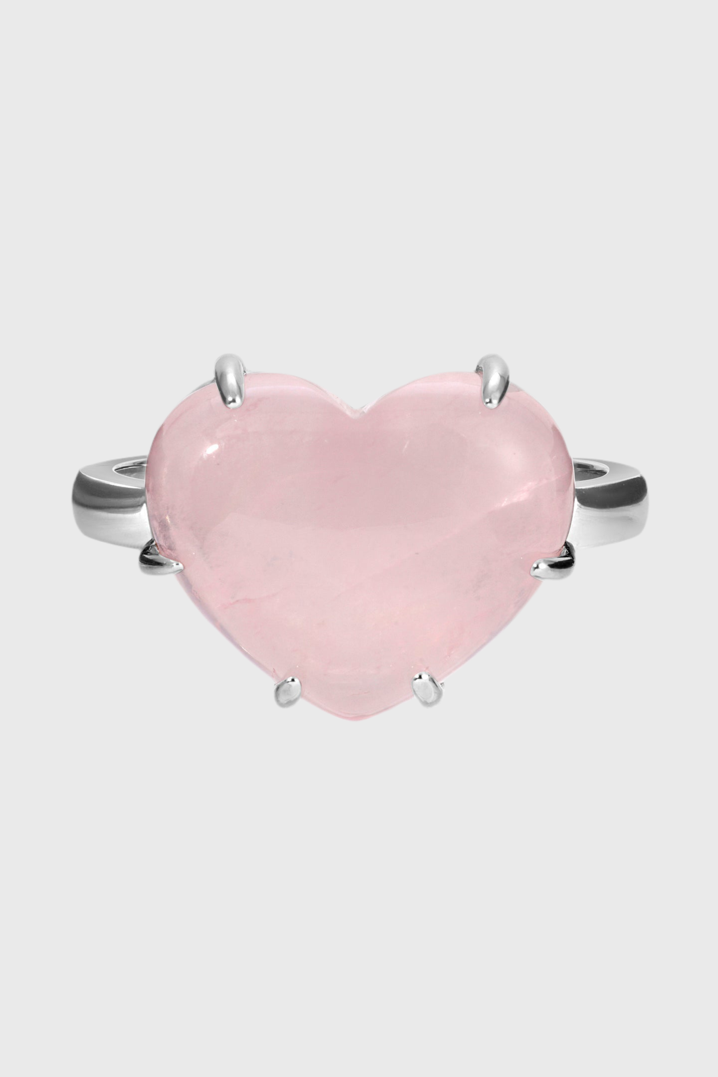 HAND CARVED CABOCHON HEART SHAPE ROSE QUARTZ COCKTAIL RING